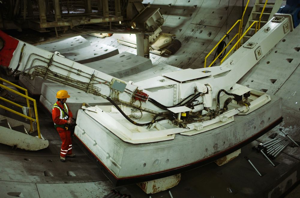 濟(jì)南市黃崗路穿黃隧道施工現(xiàn)場(chǎng),周洪強(qiáng)正在操作伸縮機(jī)吊裝管片。新華社記者張鐘仁 攝