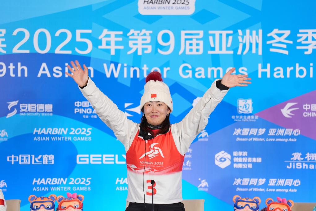 2月9日,中國選手徐夢(mèng)桃在發(fā)布會(huì)現(xiàn)場(chǎng)。當(dāng)日,第九屆亞冬會(huì)自由式滑雪女子個(gè)人空中技巧賽后新聞發(fā)布會(huì)在亞布力舉行。新華社記者 王松 攝