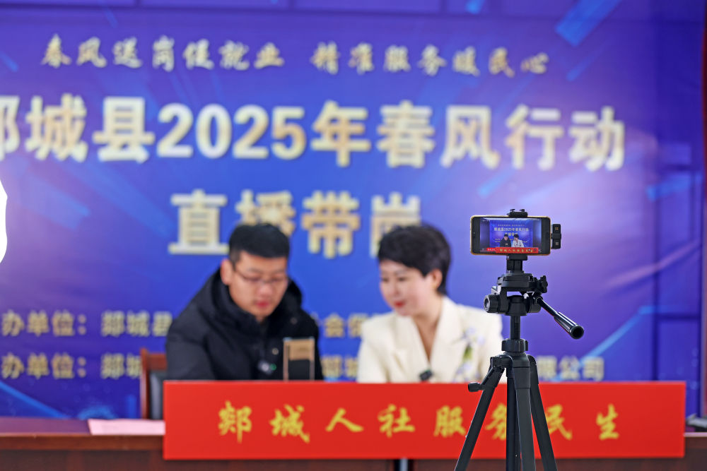 2月8日,工作人員在山東省臨沂市郯城縣“春風(fēng)行動(dòng)”專場(chǎng)招聘會(huì)現(xiàn)場(chǎng)進(jìn)行直播帶崗。新華社發(fā)(張春雷攝)