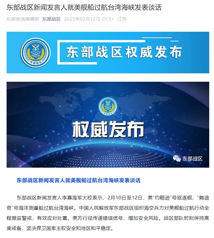 東部戰(zhàn)區(qū)新聞發(fā)言人李熹海軍大校表示,2月10日至12日,美“約翰遜”號驅(qū)逐艦、“鮑迪奇”號海洋測量船過航臺灣海峽。中國人民解放軍東部戰(zhàn)區(qū)組織??毡γ琅灤^航行動全程跟監(jiān)警戒,有效應(yīng)對處置。美方行徑傳遞錯誤信號、增加安全風(fēng)險。戰(zhàn)區(qū)部隊時刻保持高度戒備,堅決捍衛(wèi)國家主權(quán)安全和地區(qū)和平穩(wěn)定。