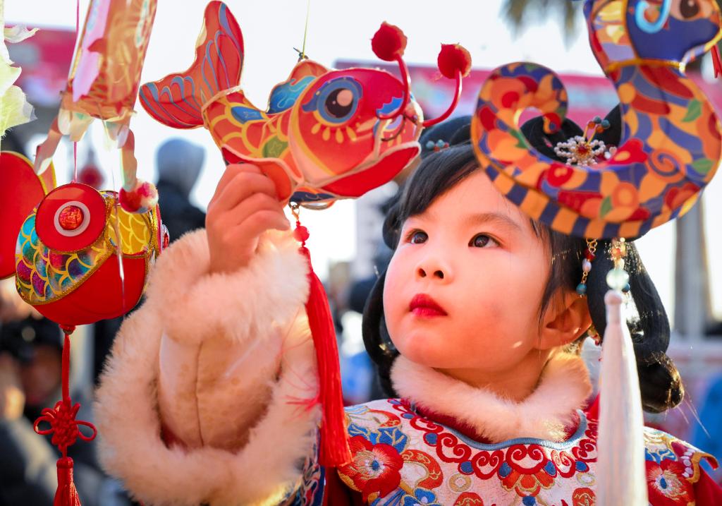 2月9日,一名小朋友在浙江省寧波市寧??h強(qiáng)蛟鎮(zhèn)峽山村迎元宵節(jié)活動(dòng)中專注賞燈。新華社發(fā)(胡學(xué)軍攝)