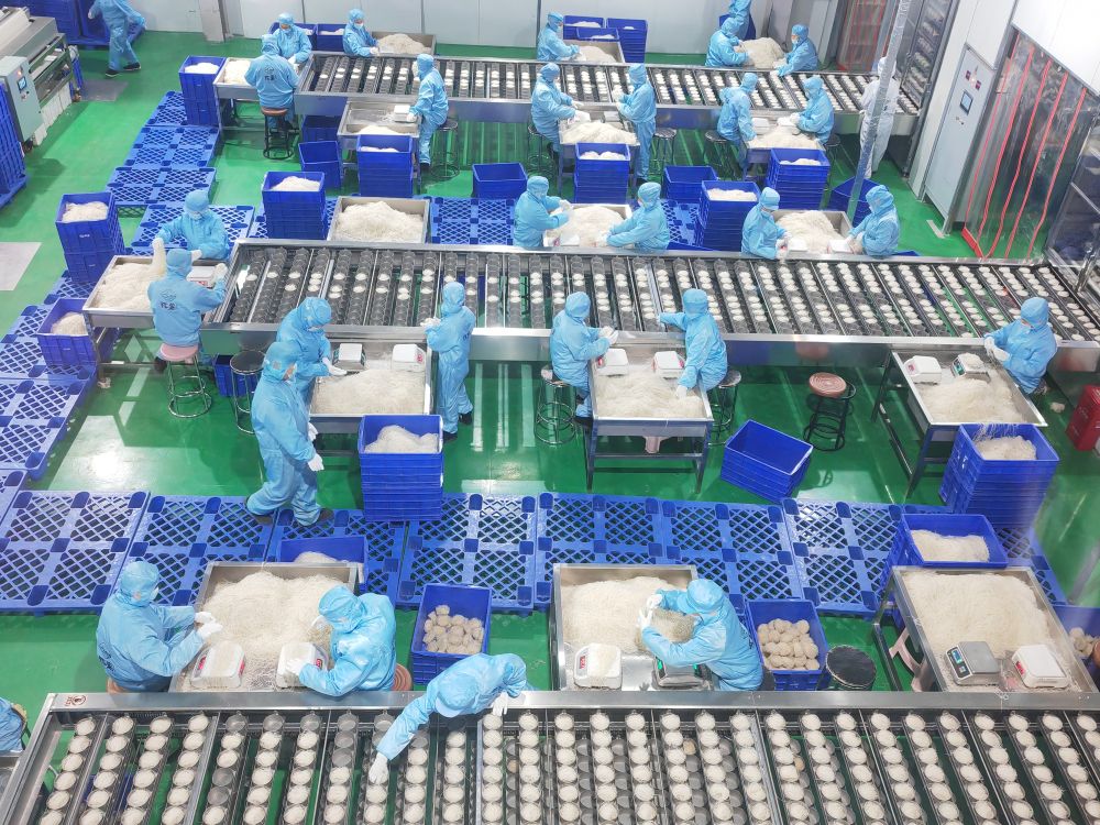 從河南引進高產(chǎn)紅薯品種、采購精深加工設(shè)備、搭建電商銷售團隊、注冊“陳薯”品牌,一番操作下來,周寨村有了現(xiàn)代化的食品加工廠。進淀粉、攪拌、定型、蒸箱熟化、掛桿……如今,記者走進生產(chǎn)車間,只見一條條生產(chǎn)線開足馬力。據(jù)了解,這里每天可生產(chǎn)數(shù)十萬桶紅薯粉。