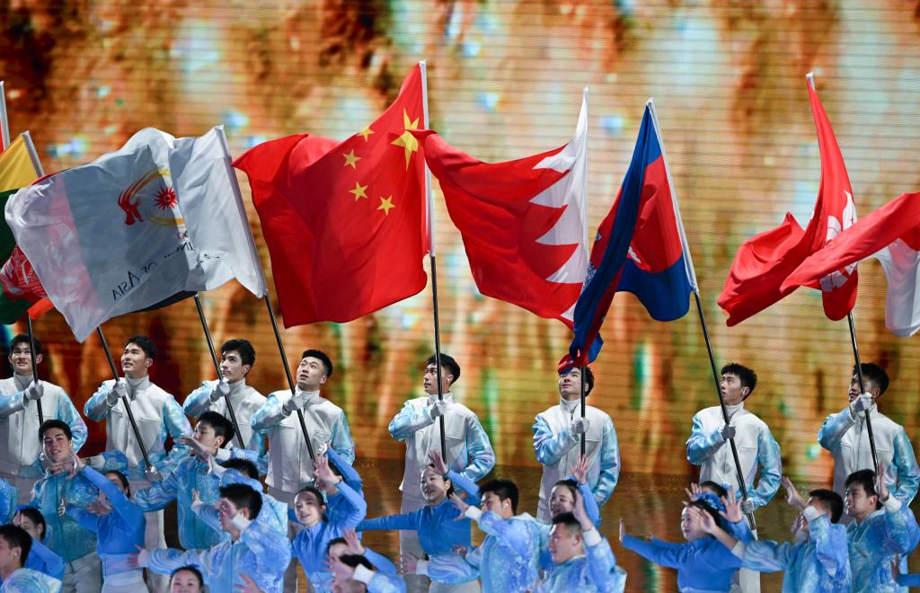 這是2月14日拍攝的各體育代表團(tuán)入場(chǎng)環(huán)節(jié)。當(dāng)日,第九屆亞洲冬季運(yùn)動(dòng)會(huì)閉幕式在哈爾濱舉行。新華社記者 黃博涵 攝