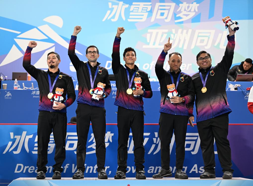 2月14日,第九屆亞冬會(huì)男子冰壺頒獎(jiǎng)儀式在哈爾濱舉行。菲律賓隊(duì)獲得冠軍。新華社記者 趙子碩 攝