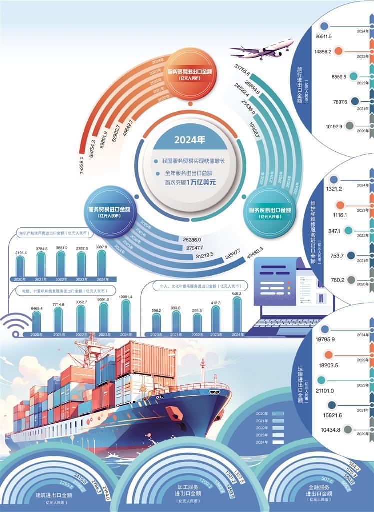商務(wù)部數(shù)據(jù)顯示,2024年我國(guó)服務(wù)進(jìn)出口總額達(dá)7.5萬億元人民幣,同比增長(zhǎng)14.4%,服務(wù)貿(mào)易規(guī)模首次突破1萬億美元,再創(chuàng)歷史新高。我國(guó)服務(wù)貿(mào)易實(shí)現(xiàn)了令人矚目的快速增長(zhǎng),展示了經(jīng)濟(jì)發(fā)展的活力和韌性,背后是多個(gè)領(lǐng)域的協(xié)同發(fā)力。