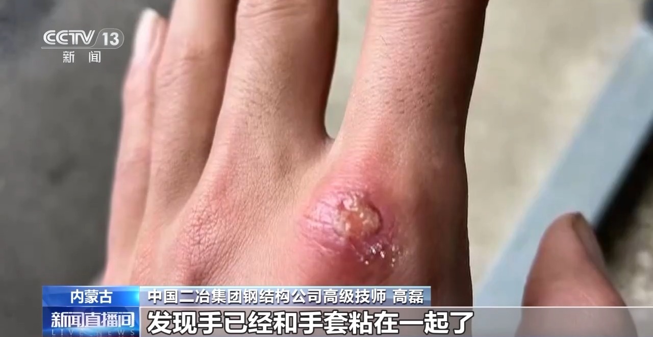 中國二冶集團鋼結(jié)構(gòu)公司高級技師 高磊:如果你中途停止的話,再重新起弧就可能造成焊接缺陷,我就沒有選擇停,我就咬著牙堅持把這段焊縫完成,直到焊到最后,等我往下摘我的焊工手套的時候,發(fā)現(xiàn)手已經(jīng)和手套粘在一起了,燙出特別大一個水泡。