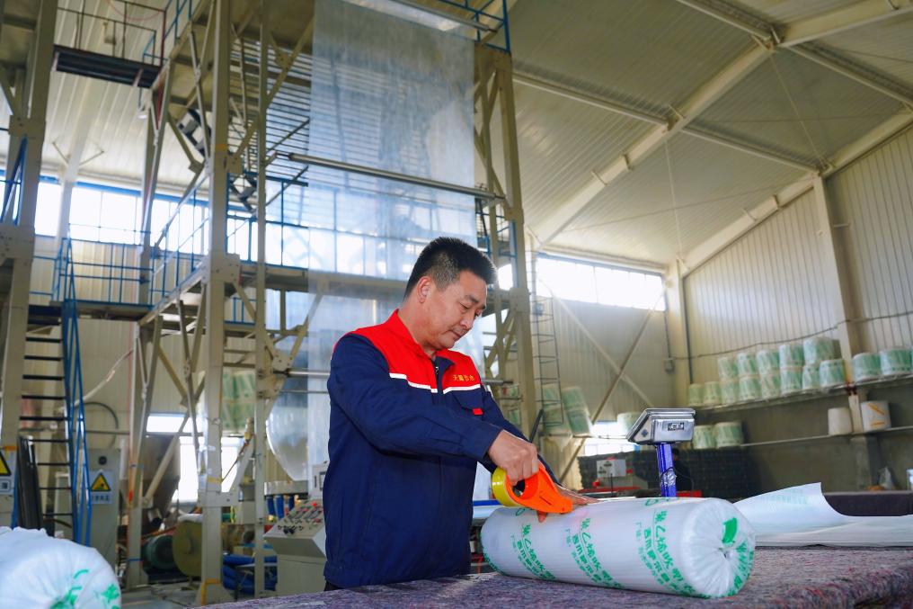 在新疆吉木薩爾縣,工人在切割、封裝生產(chǎn)下線的地膜。(受訪者供圖)