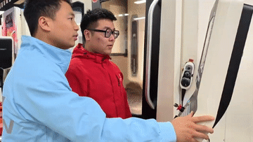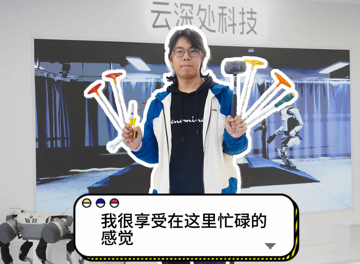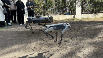 楊俊(左二)和同事為客戶展示一款行業(yè)應用四足機器人。