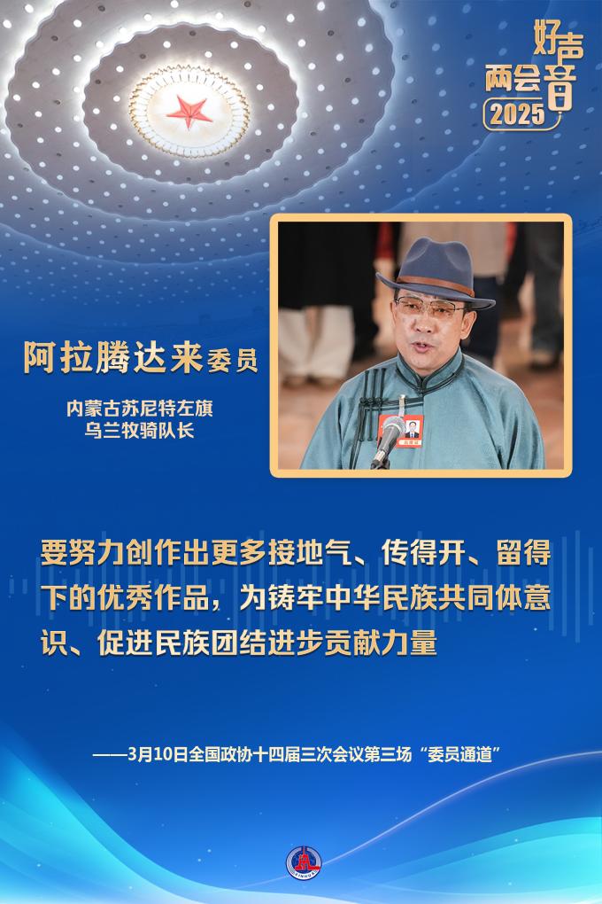 “在內(nèi)蒙古大地上,活躍著75支烏蘭牧騎隊(duì)伍,有3000多名隊(duì)員,每年開展演出1萬多場。”阿拉騰達(dá)來委員說,要努力創(chuàng)作出更多接地氣、傳得開、留得下的優(yōu)秀作品,為鑄牢中華民族共同體意識(shí)、促進(jìn)民族團(tuán)結(jié)進(jìn)步貢獻(xiàn)力量。