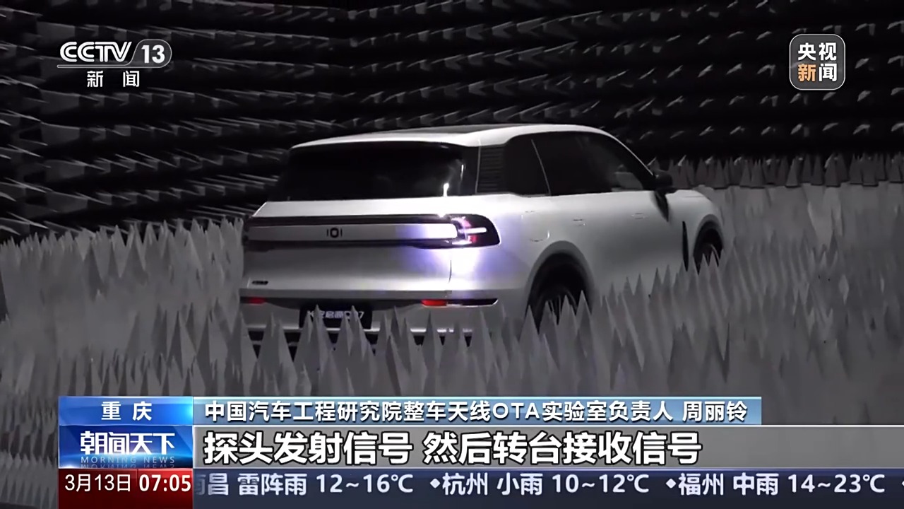 中國(guó)汽車(chē)工程研究院整車(chē)天線OTA實(shí)驗(yàn)室負(fù)責(zé)人 周麗鈴:這里是我們的一個(gè)探頭,然后配我們的轉(zhuǎn)臺(tái),探頭發(fā)射信號(hào),然后轉(zhuǎn)臺(tái)接收信號(hào),這樣的話就可以測(cè)汽車(chē)的接收性能,那它們互換一下就可以測(cè)汽車(chē)的一個(gè)發(fā)射的性能。