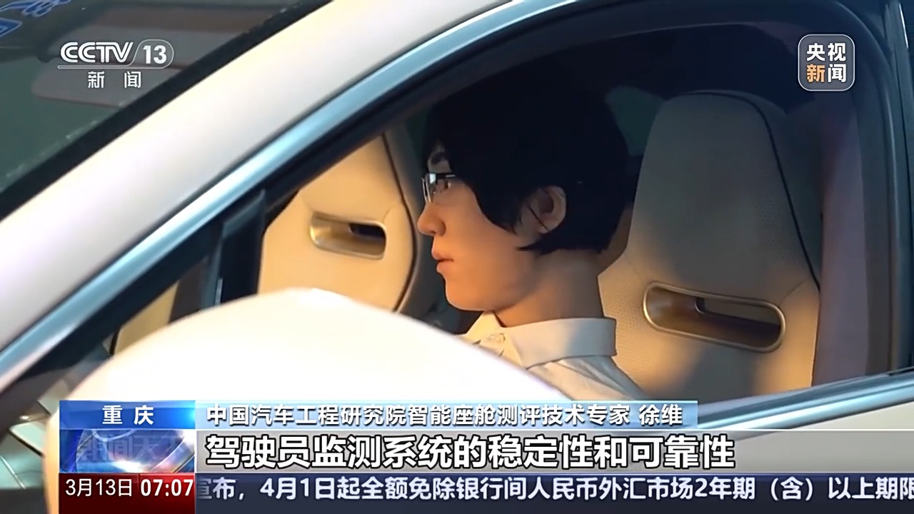中國(guó)汽車(chē)工程研究院智能座艙測(cè)評(píng)技術(shù)專家 徐維:這個(gè)仿生機(jī)器人可以去模擬駕駛員的一些手勢(shì)動(dòng)作,同時(shí)可以模擬我們眨眼睛、微笑等一些微表情,從而快速去檢測(cè)我們駕駛員監(jiān)測(cè)系統(tǒng)的穩(wěn)定性和可靠性。