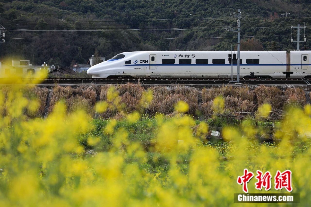 動(dòng)車(chē)組列車(chē)從貴廣高鐵黔東南州從江縣境內(nèi)的油菜花田旁駛過(guò)。中新社記者 瞿宏倫 攝