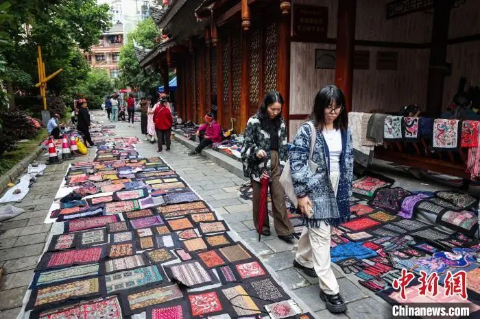 繡里淘非遺集市里的“銀飾+苗繡”組合耳飾吸引游客選購(gòu)。中新社記者 瞿宏倫 攝