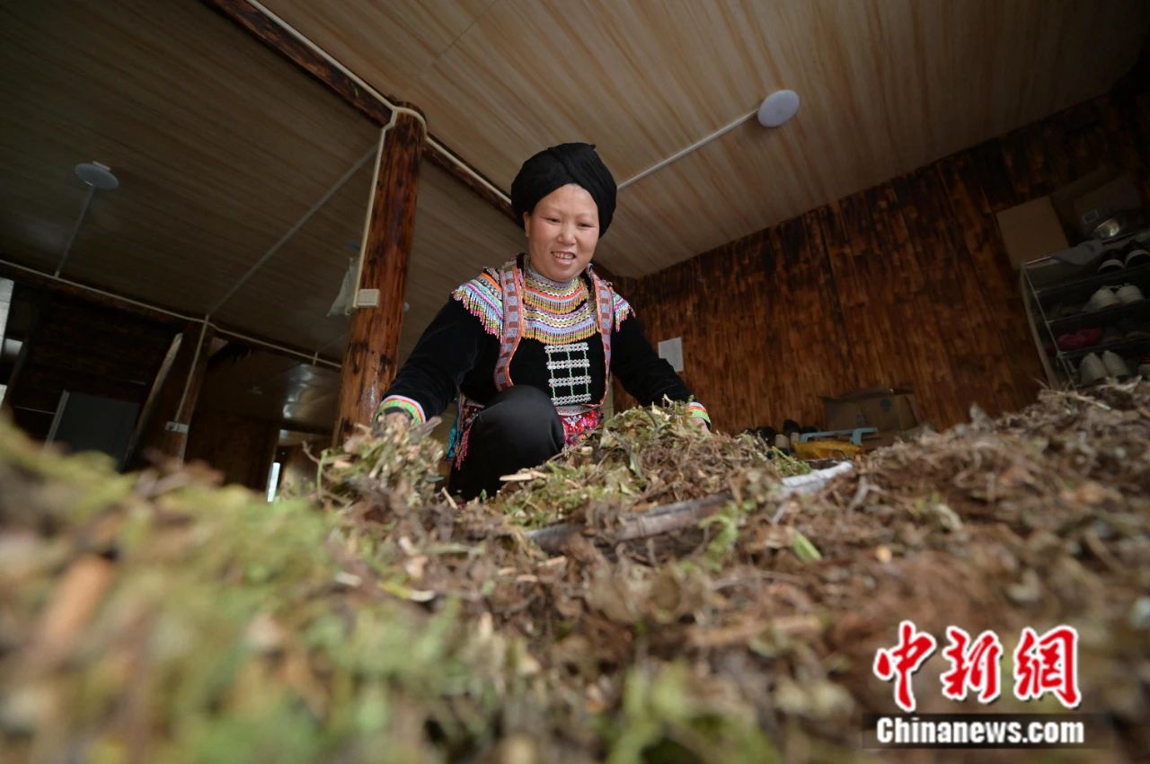 貴州省從江縣丙妹鎮(zhèn)大塘村五里坡瑤寨的村民在晾曬藥材。吳德軍 攝