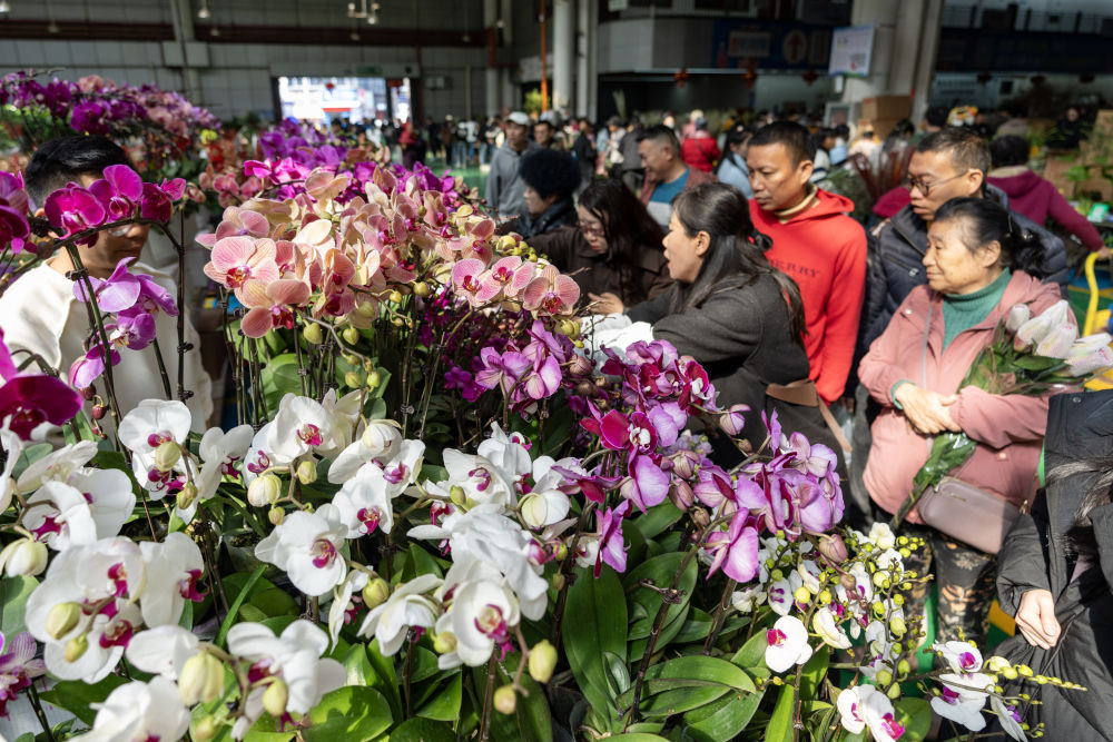 這是2025年1月22日拍攝的云南昆明斗南花卉市場一樓交易大廳,市民和游客在選購鮮花。新華社記者 陳欣波 攝