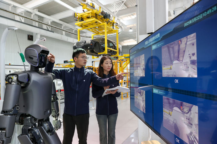 3月22日,在位于江蘇無錫的天奇股份人形機(jī)器人數(shù)據(jù)采集實訓(xùn)基地,工程師在調(diào)試人形機(jī)器人。新華社發(fā)(朱吉鵬攝)