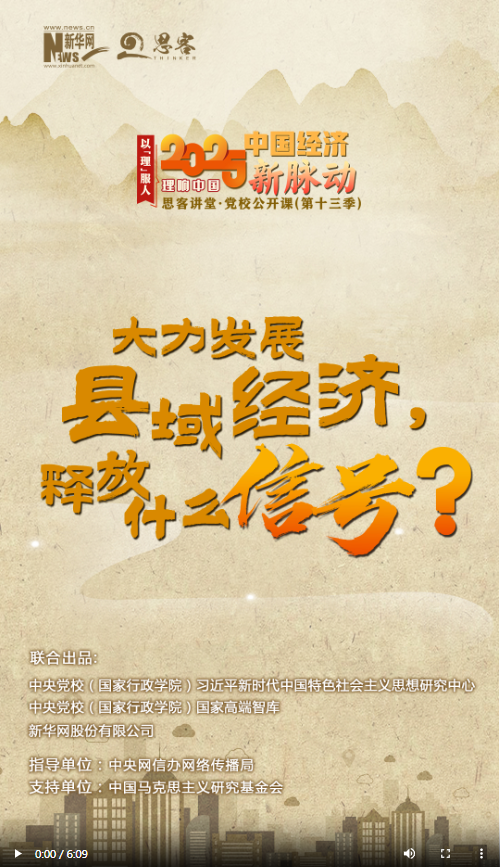 新一季“思客講堂·黨校公開課”《理響中國·以理服人|2025中國經濟新脈動》,帶你讀懂2025年經濟工作重點?!扒|大縣”不斷擴容,縣域消費“多點開花”,“縣域”二字越來越火,成為經濟發(fā)展的關鍵詞。2025年政府工作報告和2024年中央經濟工作會議都強調要大力發(fā)展縣域經濟,這釋放了什么信號?中央黨校(國家行政學院)社會和生態(tài)文明教研部教授王曉莉對此進行解讀。