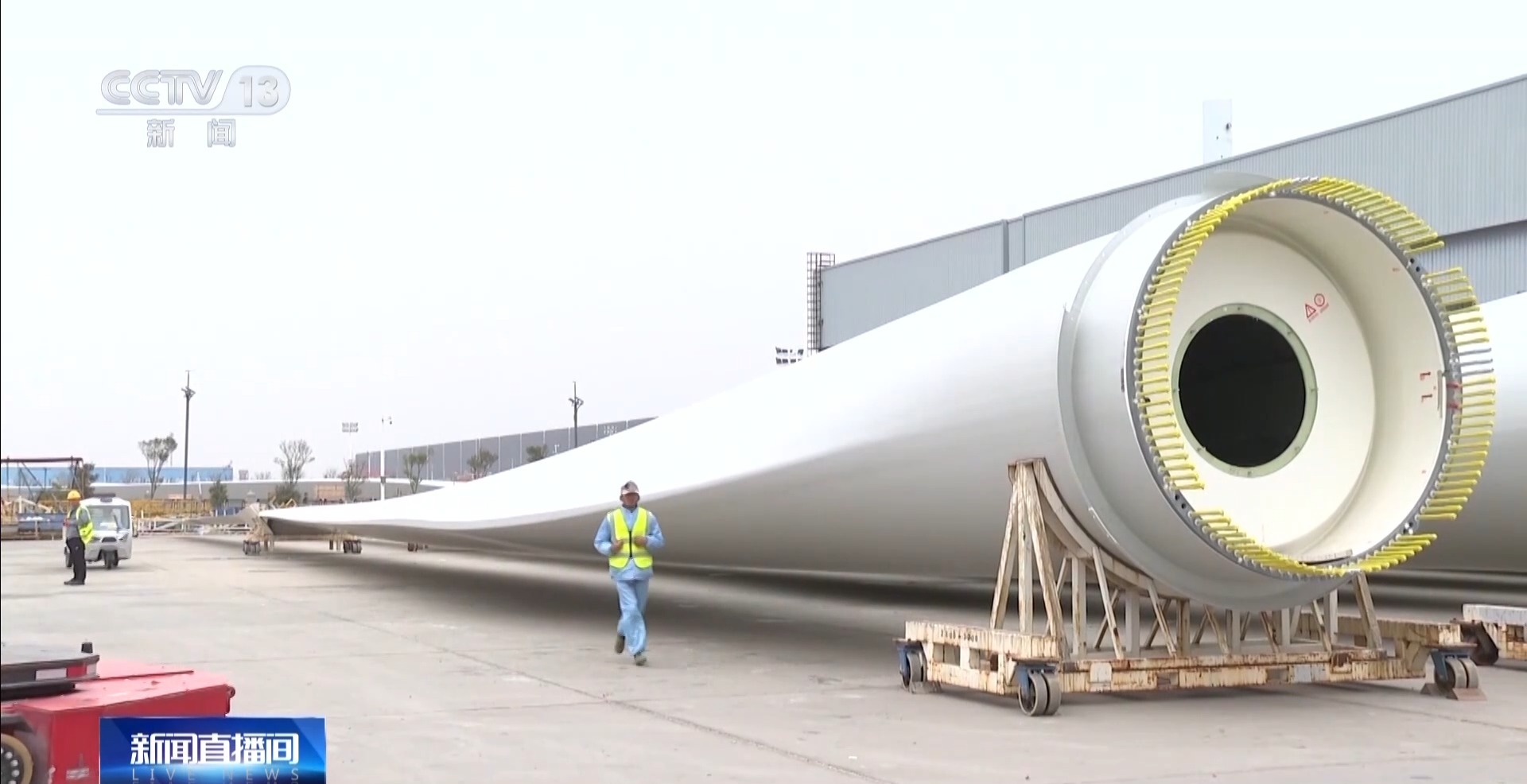 在江蘇的這家企業(yè)記者看到,各種不同型號的風機葉片正在進行揮舞和擺振實驗,每只葉片要經(jīng)歷300萬次左右這樣的實驗。在廠區(qū)里,一支82米的風機葉片即將出廠發(fā)往風場,和普通的葉片不同,這些葉片在使用特殊溶液后,它的主要材料都是可以回收的。