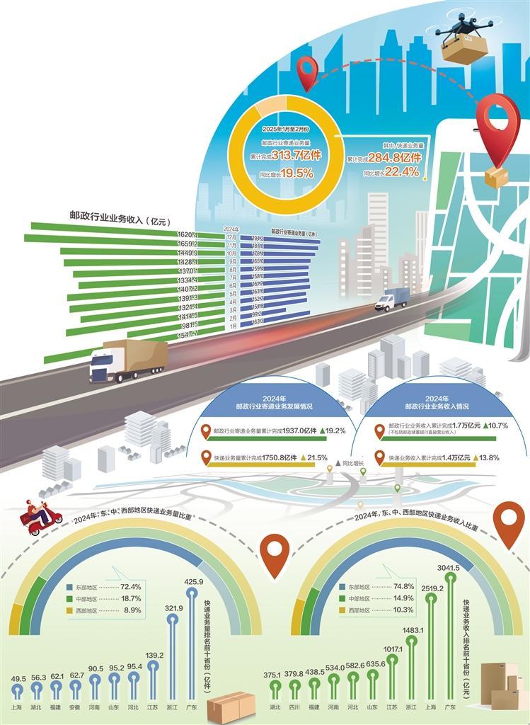 跨越式發(fā)展背后也是超大規(guī)模市場的有力支撐。去年全國網(wǎng)上零售額增長7.2%,連續(xù)12年成為全球最大網(wǎng)絡零售市場,這為快遞業(yè)發(fā)展提供了廣闊空間。從區(qū)域結構看,去年以來,行業(yè)企業(yè)積極破解新疆、內(nèi)蒙古等地“不包郵”問題,有力激發(fā)中西部地區(qū)消費潛力。2024年,中部、西部快遞業(yè)務量同比增長30%、35%,成為支撐快遞規(guī)模增長的新引擎。