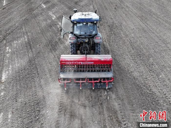 新疆巴音郭楞蒙古自治州庫(kù)爾勒市,搭載北斗導(dǎo)航系統(tǒng)的播種機(jī)在田間有序作業(yè)。確·胡熱 攝