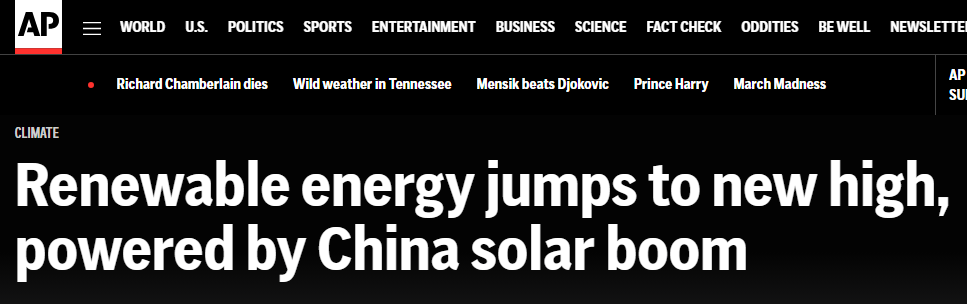 報(bào)道稱,中國(guó)太陽能熱潮推動(dòng)了全球可再生能源發(fā)展。數(shù)據(jù)顯示,2024年,中國(guó)可再生能源發(fā)電新增裝機(jī)約3.74億千瓦,其中四分之三來自太陽能發(fā)電。