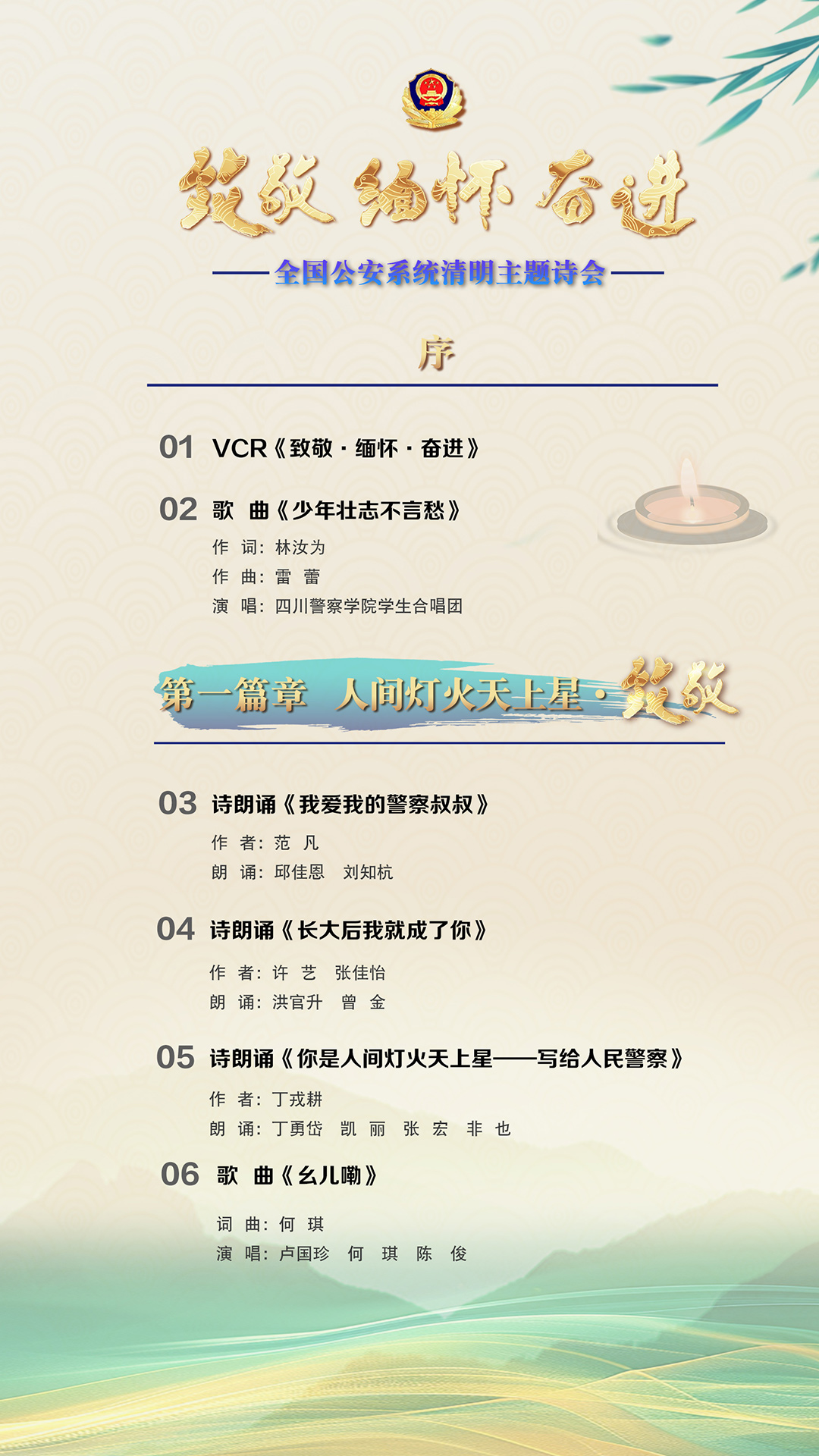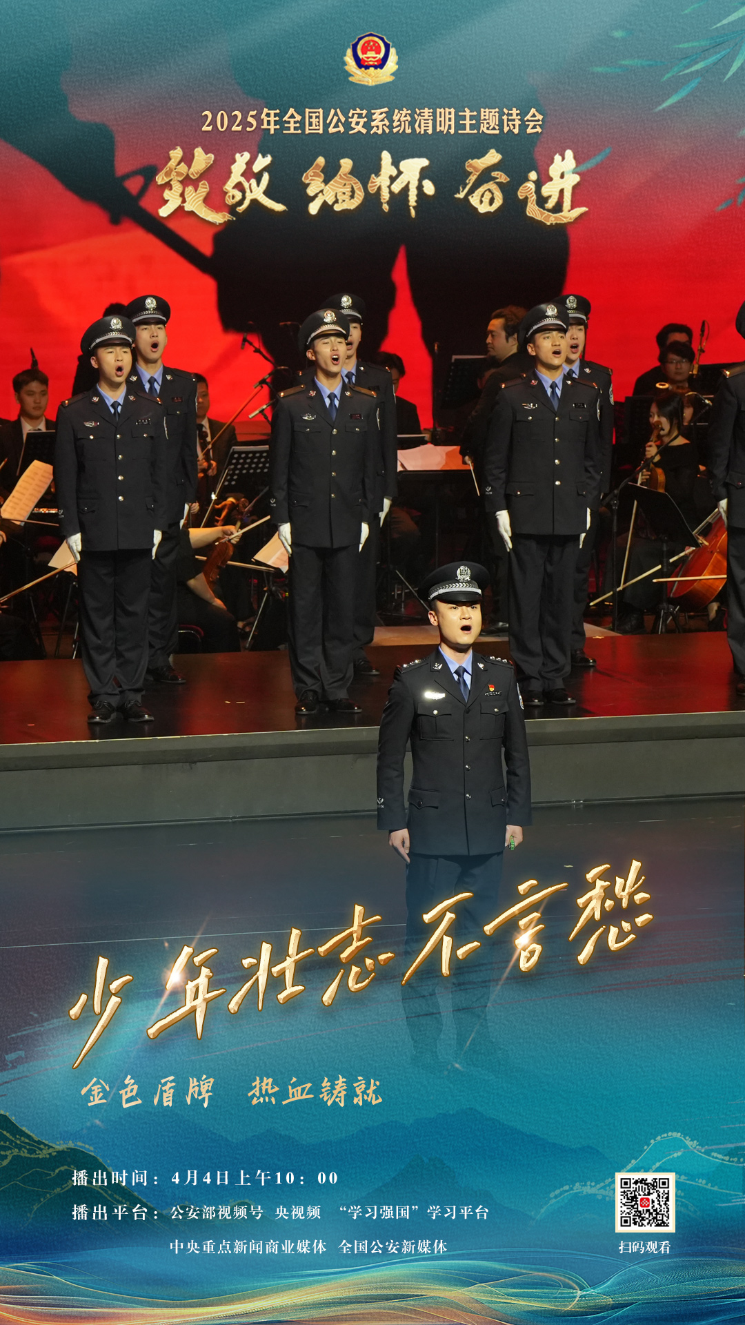 為充分展現(xiàn)全國(guó)公安機(jī)關(guān)和廣大公安民警、輔警時(shí)刻銘記習(xí)近平總書(shū)記的關(guān)心關(guān)懷,時(shí)刻為黨和人民而戰(zhàn)的忠誠(chéng)政治本色,深情追憶一年來(lái)公安系統(tǒng)涌現(xiàn)的英雄模范感人事跡,激勵(lì)引導(dǎo)廣大公安民警以更加奮發(fā)有為的精神面貌,堅(jiān)決履行好黨和人民賦予的神圣職責(zé)使命,今年清明節(jié)當(dāng)天,公安部新聞宣傳局、全國(guó)公安文聯(lián)、四川省公安廳聯(lián)合舉辦“致敬·緬懷·奮進(jìn)”2025年全國(guó)公安系統(tǒng)清明主題詩(shī)會(huì)。
