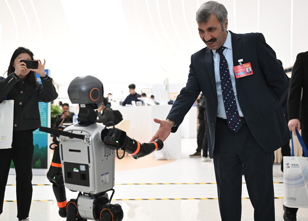 3月27日,與會(huì)嘉賓與一款加速T1機(jī)器人握手。(圖片來(lái)源:新華社)