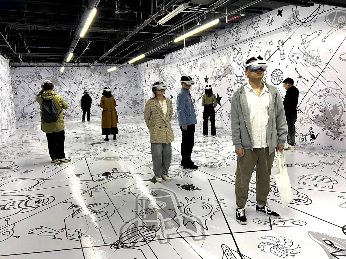 3月27日,在北京市石景山區(qū)首鋼園的沉浸式科幻空間展廳,參觀者戴上頭顯裝置,體驗(yàn)遙在(山東)數(shù)字科技有限公司打造的星際奇航旅程體驗(yàn)項(xiàng)目。(圖片來(lái)源:新華社)