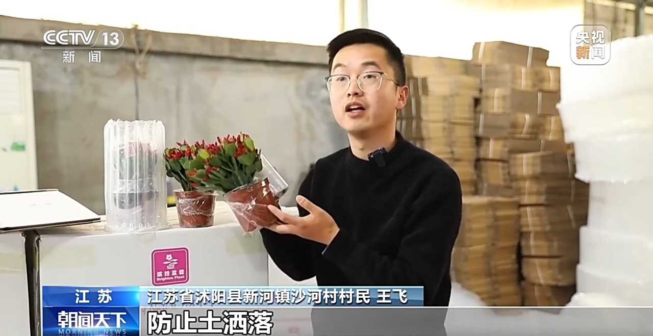 江蘇省沭陽縣新河鎮(zhèn)沙河村村民 王飛:我們先用保鮮膜鎖住盆里面的水分,防止土灑落,這樣的包裝可以讓花到買家手里時(shí)更新鮮一點(diǎn)。然后會用到防摔的氣柱,能保護(hù)花朵。