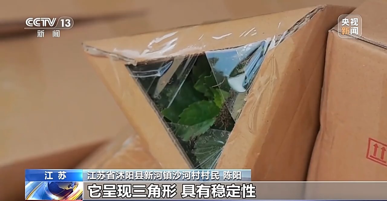江蘇省沭陽縣新河鎮(zhèn)沙河村村民 陳陽:三角板是環(huán)保透氣性的材料,包裝完之后,它呈現(xiàn)三角形狀,具有穩(wěn)定性,植物不會受損傷。