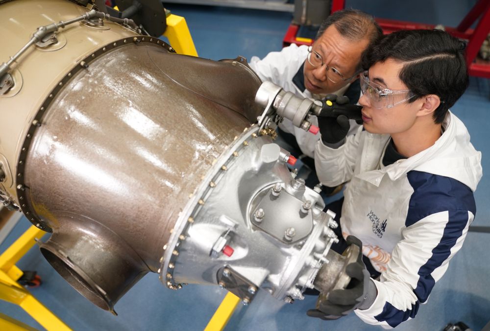 在香港專(zhuān)業(yè)教育學(xué)院,黃富東(右)在檢查渦輪螺旋槳飛機(jī)引擎(1月14日攝)。新華社發(fā)(王申攝)