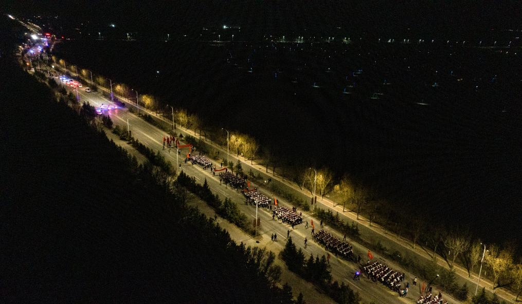 4月3日凌晨,參加徒步祭英烈活動(dòng)的師生從固原市城區(qū)出發(fā),前往位于彭陽縣的任山河烈士陵園祭奠英烈(無人機(jī)照片)。