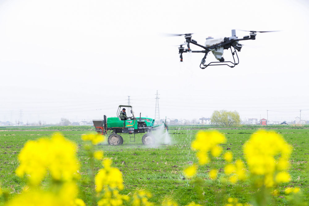 近日,在江蘇省興化市陳堡鎮(zhèn)蔣莊村,農(nóng)民駕駛植保無人機、自走式噴桿噴霧機實施雜草防治作業(yè)。 新華社發(fā)(周社根 攝)