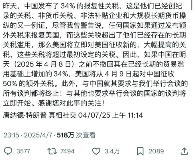 一覺醒來,特朗普再發(fā)威脅,警告中國在4月8號(hào)前取消報(bào)復(fù),不然4月9號(hào)就對(duì)中國再加50%額外關(guān)稅,此外所有和中國的談判都會(huì)中止,而和其他國家的談判將立即開始。