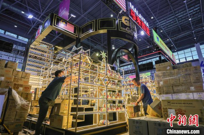4月11日,第五屆中國(guó)國(guó)際消費(fèi)品博覽會(huì)即將開(kāi)展,馬來(lái)西亞館的展商在布置展品。中新社記者 駱云飛 攝