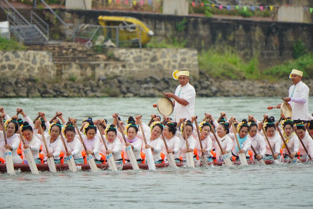 4月13日,在西雙版納傣族自治州景洪市,人們參與傳統(tǒng)龍舟表演賽。 新華社記者 高詠薇 攝