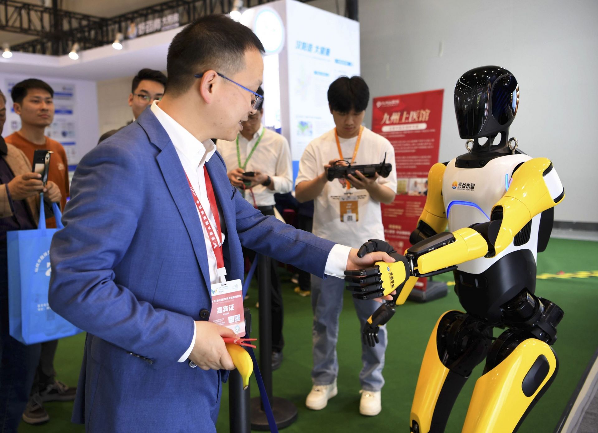 3月20日,在武漢國際會展中心,2025武漢馬拉松迎來了首個參賽選手報到領(lǐng)物日。委內(nèi)瑞拉選手吳瑞龍看見人形機器人志愿者,開心地上前與它握手。