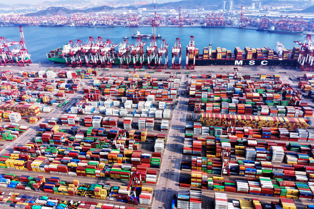 這是2月23日拍攝的山東港口青島港外貿(mào)集裝箱碼頭(無人機照片)。2025年以來,青島港開通2條到東南亞、地中海方向的“一帶一路”航線,合計新開4條國際集裝箱航線,加快世界一流海洋港口建設(shè)。新華社發(fā)(俞方平 攝)