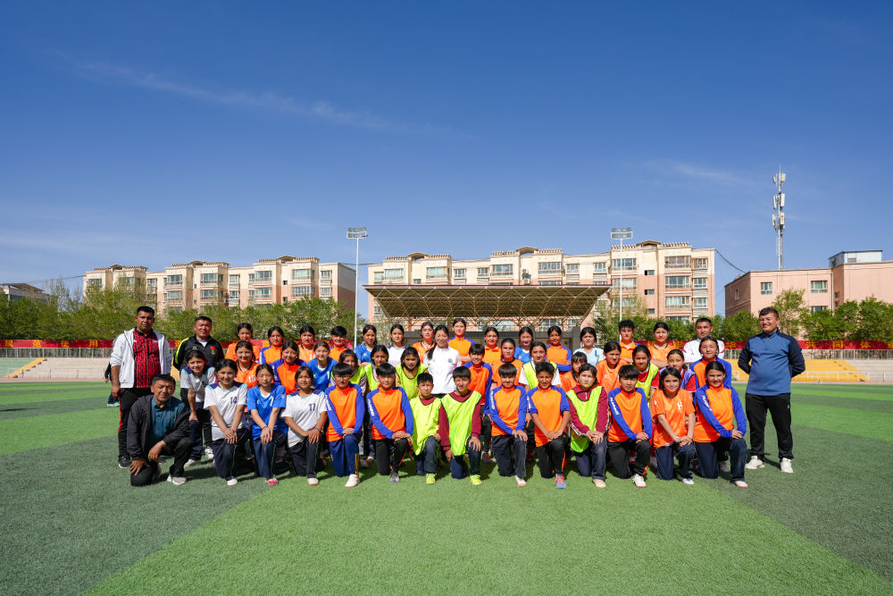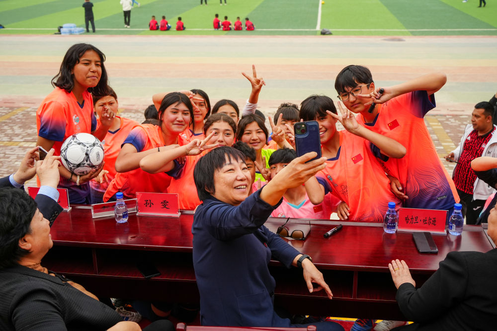 ↑4月12日,在2025新疆克孜勒蘇柯爾克孜自治州足球聯(lián)賽開幕式后,中國足協(xié)副主席、前中國國家女子足球隊球員孫雯(前)與阿圖什市U13女子足球隊合影。新華社記者 徐宏巖 攝