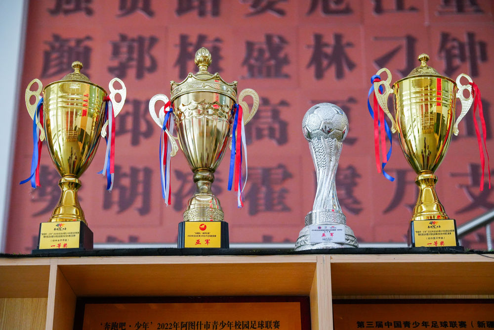 ↑這是4月14日在新疆克孜勒蘇柯爾克孜自治州阿圖什市硝魯克中學(xué)拍攝的獎杯。新華社記者 徐宏巖 攝