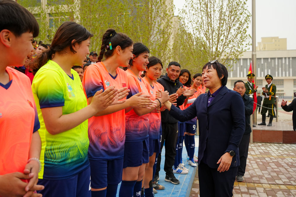 ↑4月12日,2025新疆克孜勒蘇柯爾克孜自治州足球聯(lián)賽開幕式后,中國足協(xié)副主席、前中國國家女子足球隊球員孫雯(前右一)與阿圖什市U13女子足球隊隊員阿依謝·托乎達洪(左三)交流。新華社記者 徐宏巖 攝