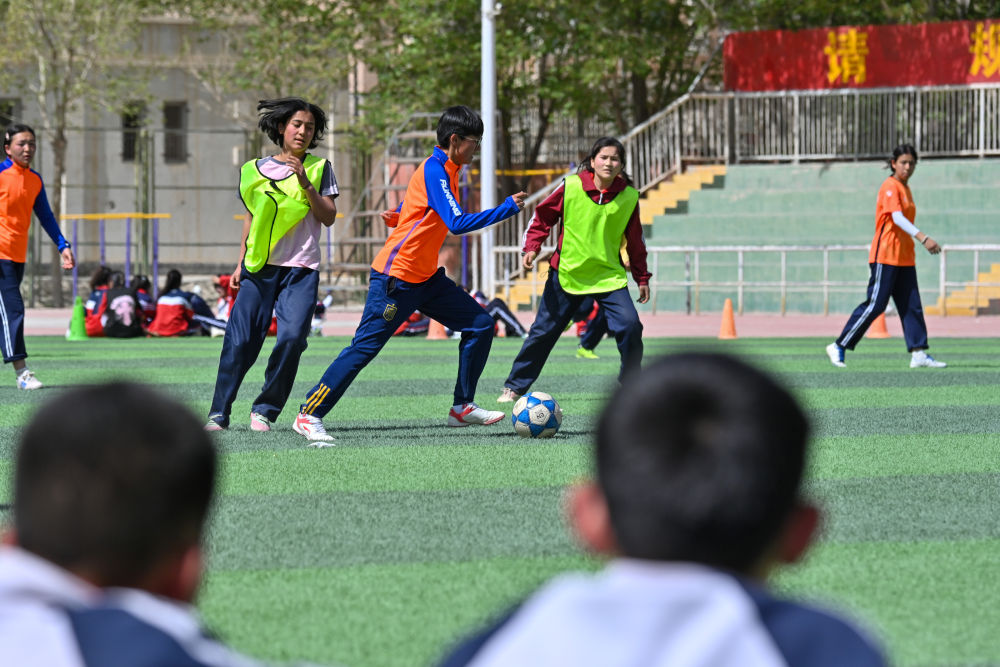 ↑4月10日,在阿圖什市硝魯克中學(xué),球隊中場球員帕提麥·肉孜買買提(左)在進行運球訓(xùn)練。新華社記者 徐宏巖 攝