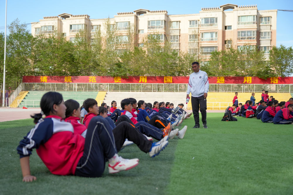 ↑4月10日,在阿圖什市硝魯克中學(xué),隊員們在教練如扎吉的指導(dǎo)下進行訓(xùn)練。新華社記者 徐宏巖 攝