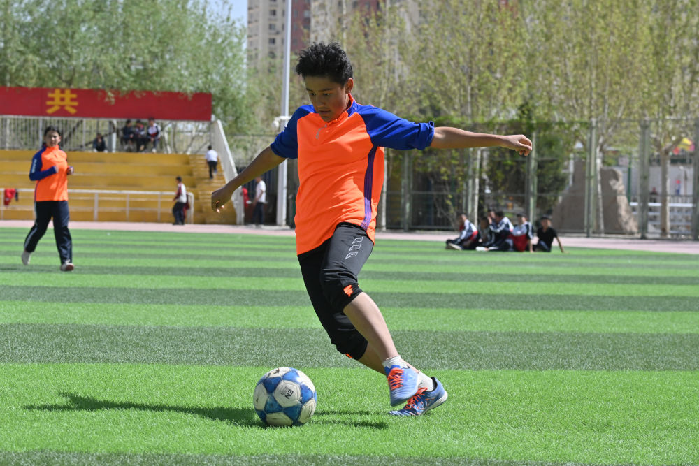 ↑在阿圖什市硝魯克中學(xué),球隊前鋒謝爾克努爾·亞力坤在訓(xùn)練賽中帶球進攻。新華社記者 徐宏巖 攝