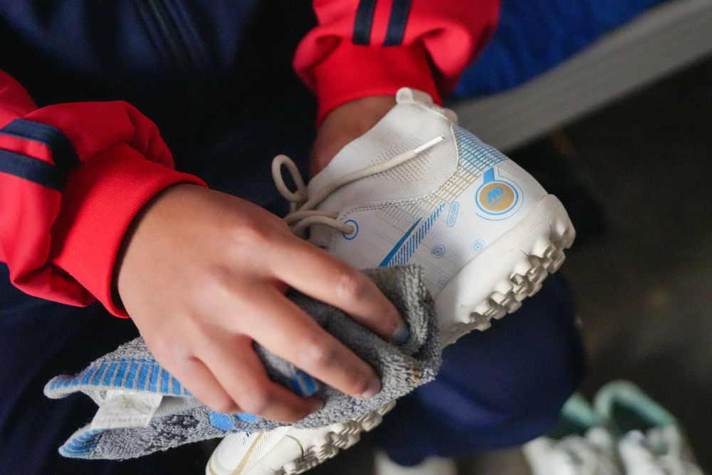 ↑4月10日,在阿圖什市硝魯克中學(xué)宿舍,一名球隊球員在擦拭自己心愛的球鞋。球員們的裝備由學(xué)校免費發(fā)放。新華社記者 徐宏巖 攝