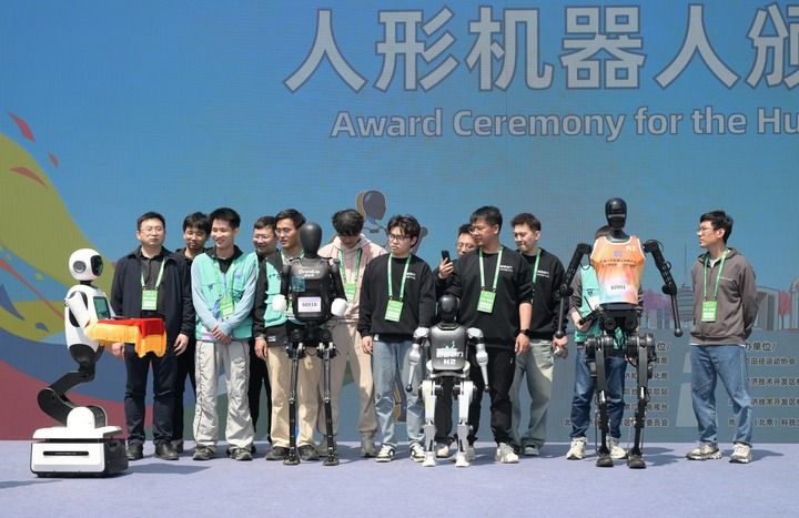 2025年4月19日,一臺機器人在人形機器人頒獎儀式上托舉著獎牌走向獲獎機器人選手和技術(shù)團隊。當(dāng)日,2025北京亦莊半程馬拉松暨人形機器人半程馬拉松舉行。新華社記者 李賀 攝