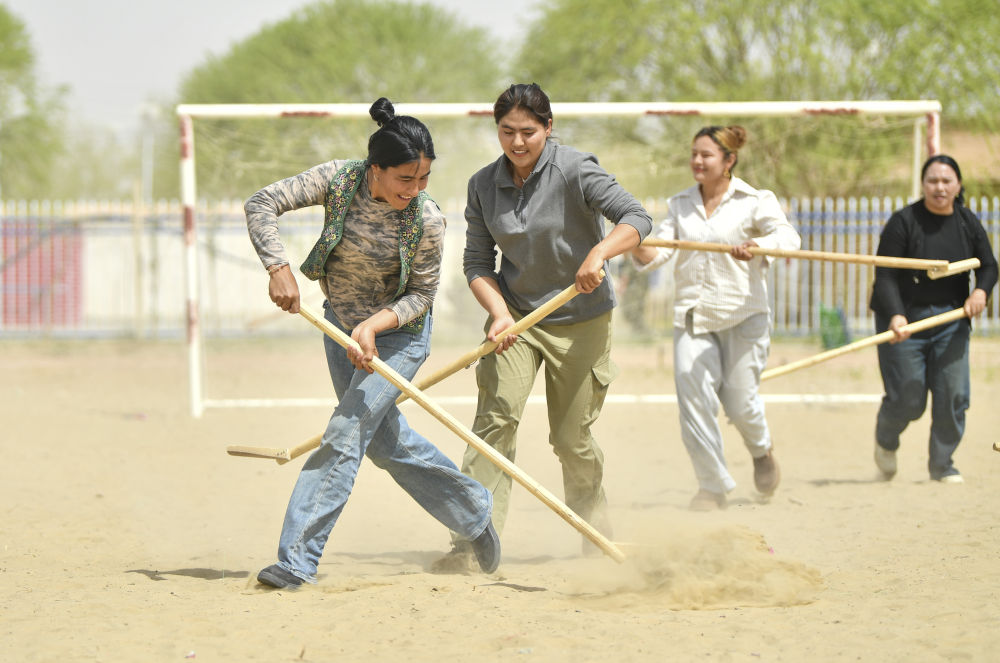 達(dá)里雅布依鄉(xiāng)女子麥熱球隊(duì)的訓(xùn)練場地,就是一片被胡楊、紅柳包圍著的沙地操場。麥熱球類似曲棍球,是一種在新疆和田地區(qū)廣泛流行的古老運(yùn)動(dòng)。這項(xiàng)群眾性運(yùn)動(dòng)并沒有過于嚴(yán)格的規(guī)則,一片空地,三五好友,興之所起,即可揮桿。2021年,麥熱球被正式列入國家級(jí)非物質(zhì)文化遺產(chǎn)代表性項(xiàng)目名錄。