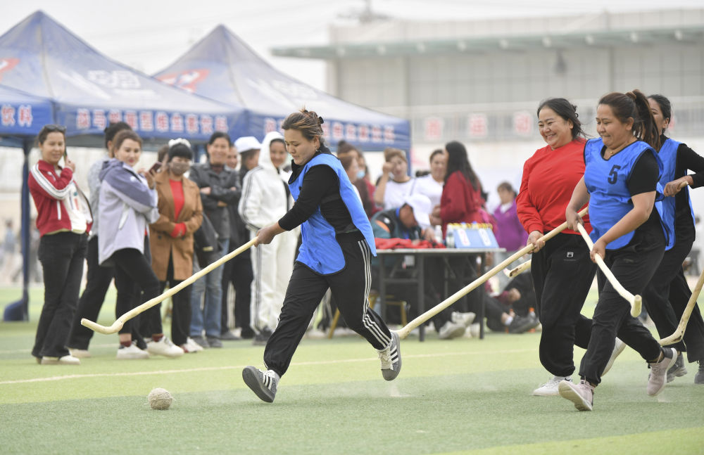39歲的阿依古麗·買托合提是球隊(duì)里最年長的隊(duì)員。她身穿皮衣、腳踏休閑鞋,奔跑在正午驕陽下,屢屢揮動(dòng)球桿,拼搶也毫不遜色。一起訓(xùn)練的隊(duì)友有人穿著牛仔褲,有人穿著襯衫,還有人穿著后跟略高的鞋子。紅色的球洞穿由兩個(gè)塑料水瓶組成的球門,得分的一方歡呼不已,失球的隊(duì)員則懊惱地擦去臉上的沙塵。