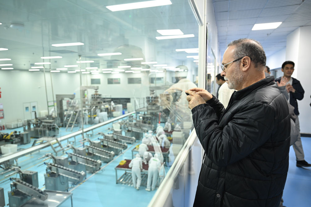 4月26日,外賓在參觀位于喀什的一家農(nóng)業(yè)科技有限公司時拍照記錄工廠生產(chǎn)線。新華社記者 辛悅衛(wèi) 攝
