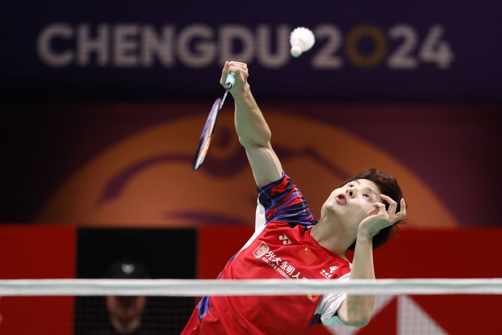 2024年5月5日,在四川成都舉行的2024年湯姆斯杯羽毛球團(tuán)體賽決賽中,中國(guó)隊(duì)選手石宇奇在男子單打比賽中回球。新華社記者 沈伯韓 攝